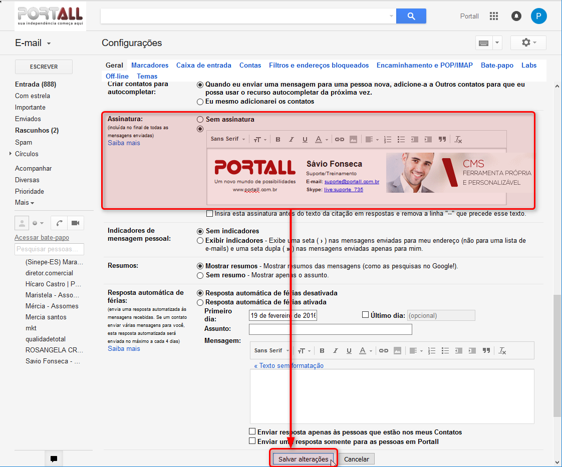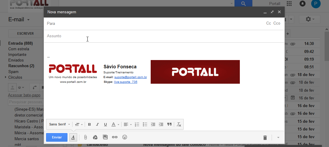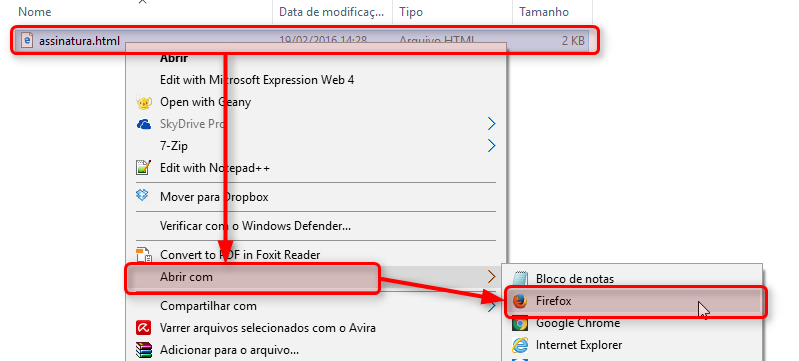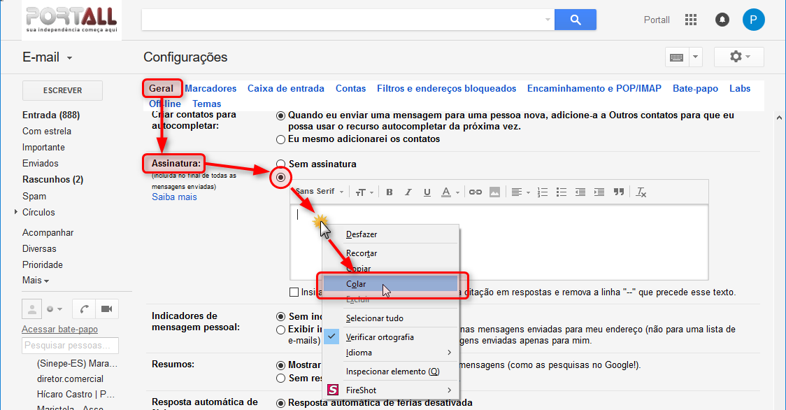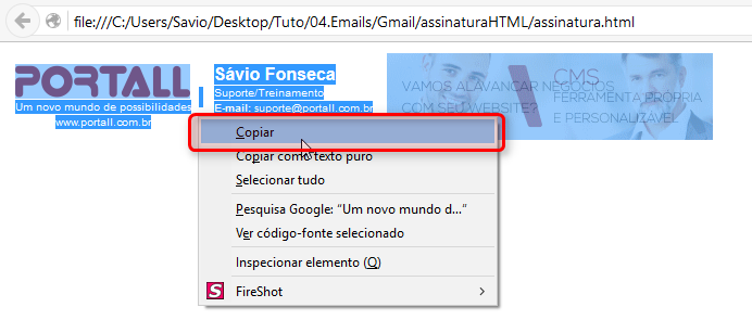 *Acompanhe o texto juntamente das imagens. *Com o arquivo da assinatura em formato HTML salvo na máquina, siga os passos. Clique com o botão direito do mouse no arquivo HTML, passe o cursor do mouse em [Abrir com] e clique no navegador de sua preferência (ATENÇÃO: o arquivo deve ser aberto com um NAVEGADOR, e não qualquer outro software); ![]() Selecione todo o conteúdo da assinatura com o mouse ou pressionando CTRL+A no teclado, clique com o botão direito do mouse sobre o conteúdo e em [Copiar] ou pressione CTRL+C no teclado; ![]() Neste momento você está com o código HTML da assinatura copiado. Agora, acesse o Gmail, clique na engrenagem e em [Configurações] como ilustrado abaixo; ![]() Na aba [Geral], navegue até a área [Assinatura], selecione a opção destacada abaixo; Clique com o botão direito do mouse no editor de texto e clique em [Colar], ou coloque o cursor do mouse no editor de texto e pressione CTRL+V no teclado; ![]() A assinatura deverá ser exibida no editor de texto do Gmail da mesma forma que foi aberta no navegador no primeiro passo. Clique em [Salvar alterações]; ![]() Pronto! A assinatura estará configurada para utilização conforme abaixo; ![]() DIFICULDADES? Abra um chamado com nosso Suporte Técnico clicando aqui! |